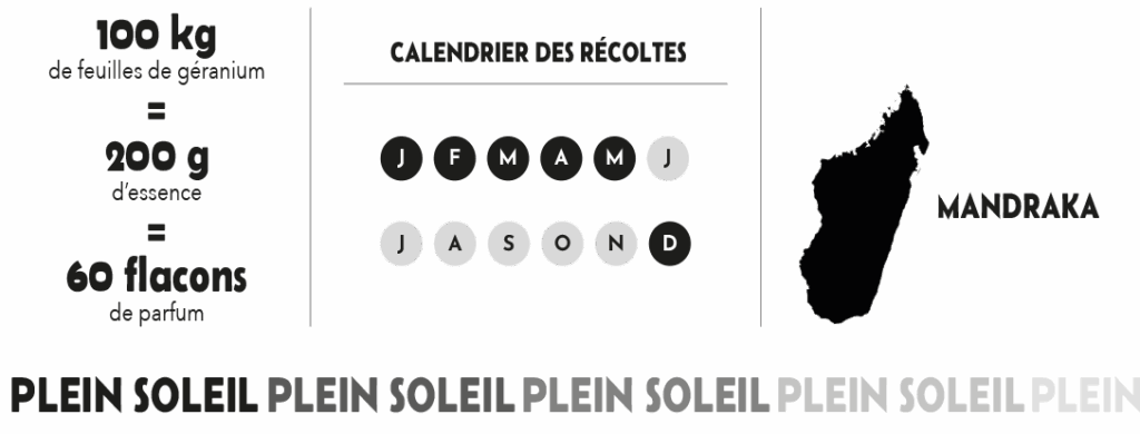 Jean : Le géranium pousse au sein d’un écosystème de cinq entités : un arbre fruitier comme un avocatier, du lemongrass, un caféier, le géranium et des ruches pour favoriser la pollinisation.Comment as-tu pensé la création de Plein Soleil ?